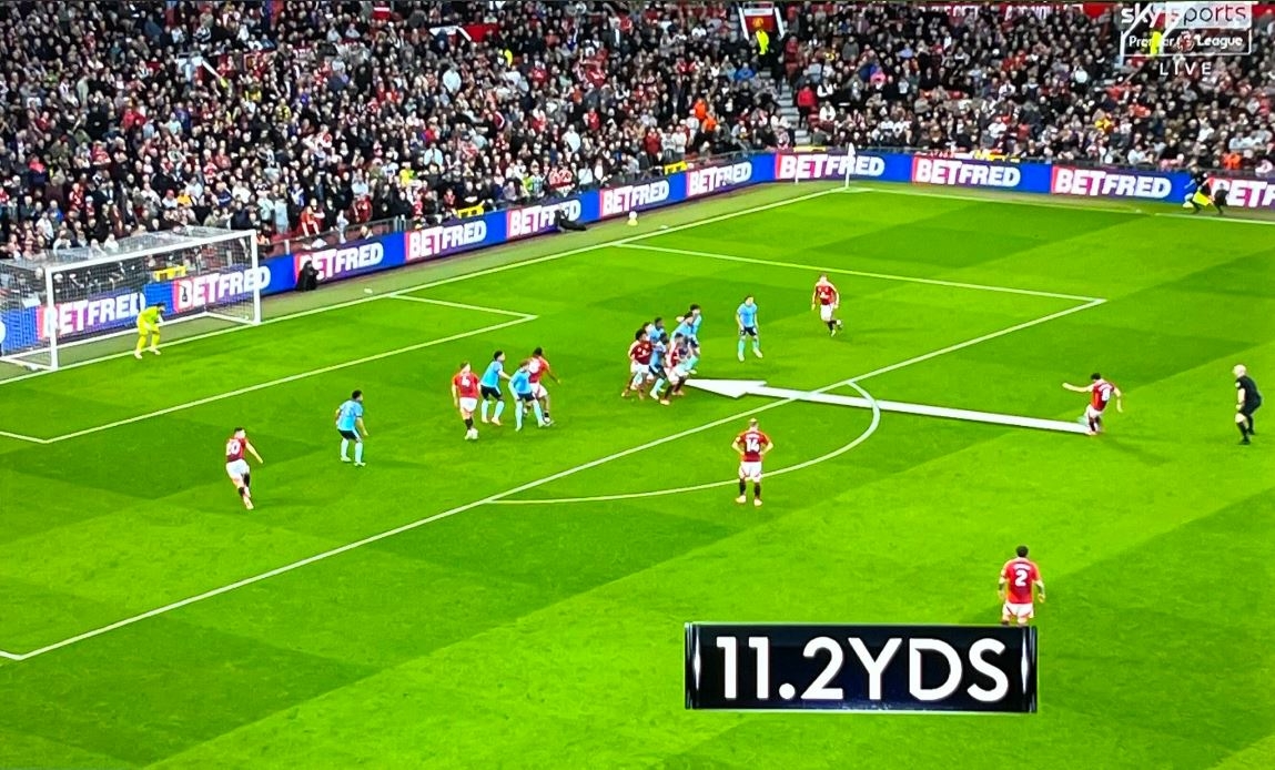 人墻失誤?轉(zhuǎn)播顯示B費任意球距槍手人墻11.2碼,規(guī)則僅要求10碼